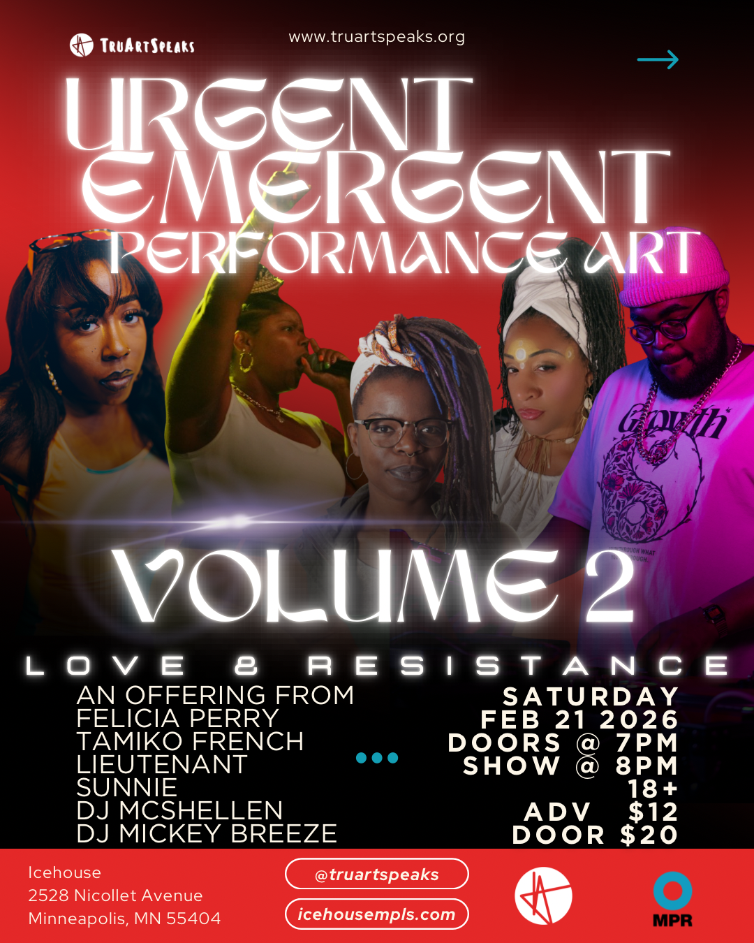 Join Tish as she hosts this much needed space. Love & Resistance, Volume Two of The Urgent Emergent Performance Art Series (Urgent Art Series), is a restorative dance party dedicated to those artists, organizers, healers, and everyone in between, who have been deep in the heart work that 2026 has required of us.